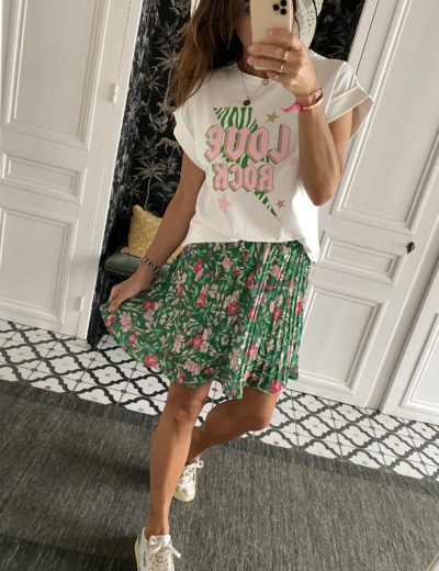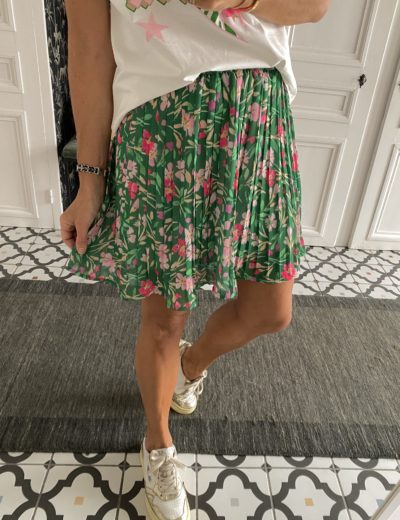 Jupe courte plissée fleurs vert