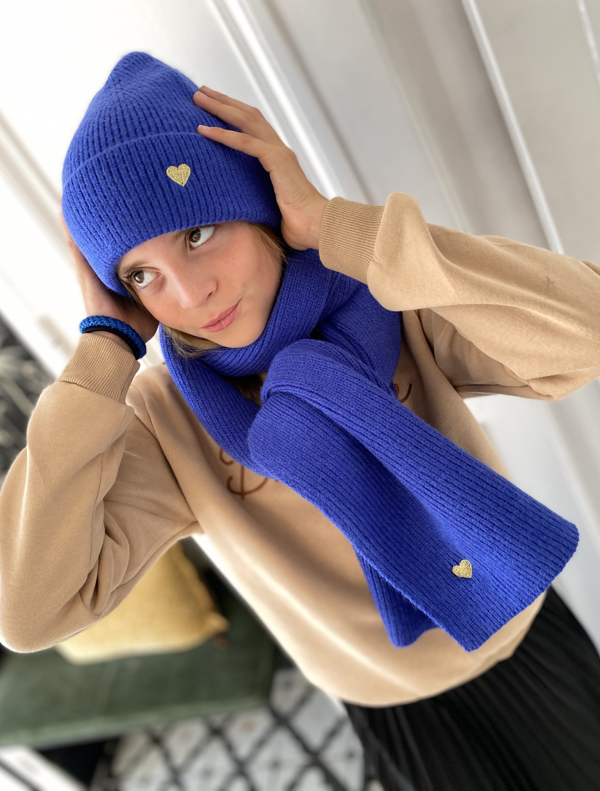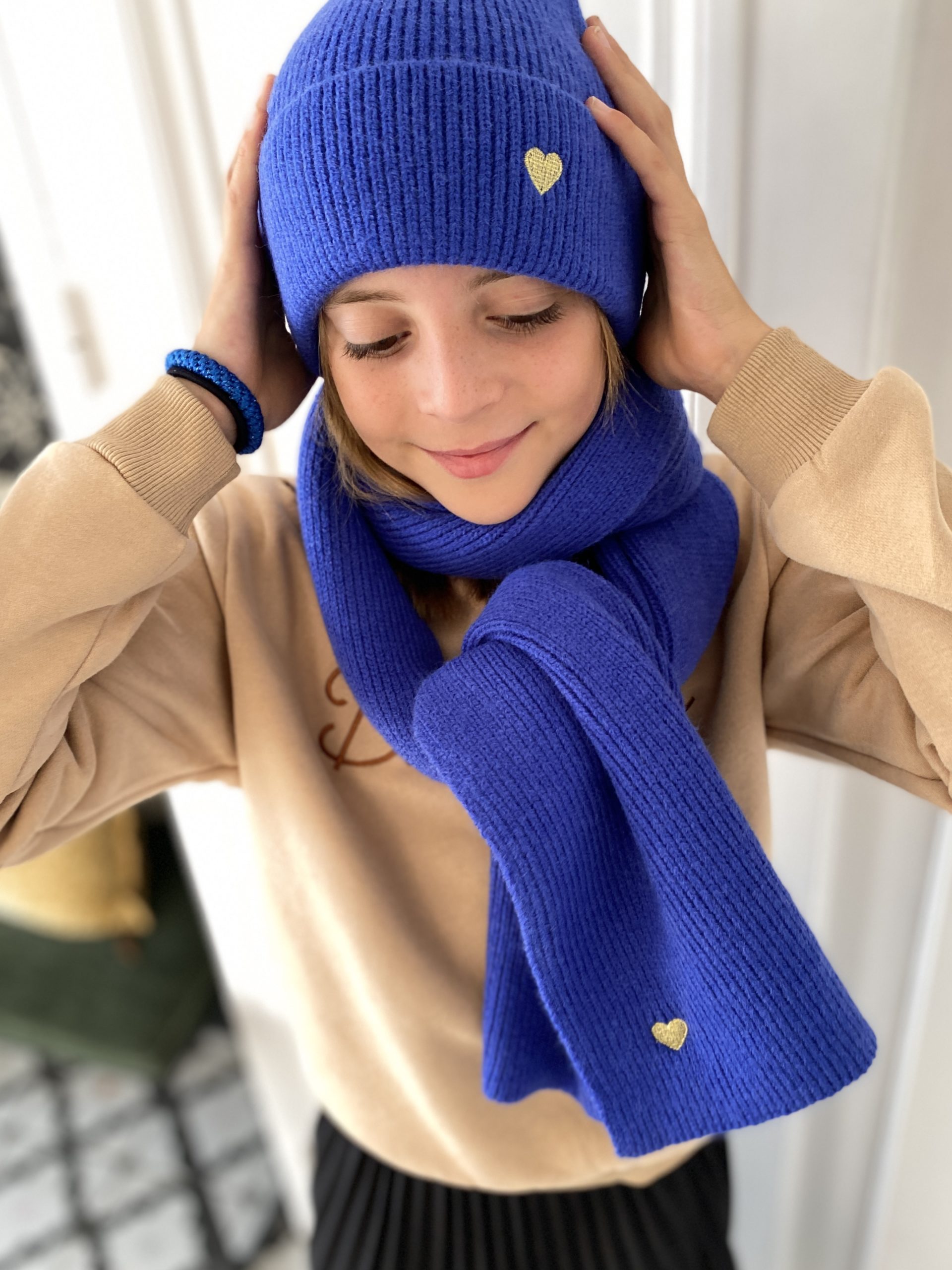 quantité de Ensemble bonnet écharpe coeur doré bleu