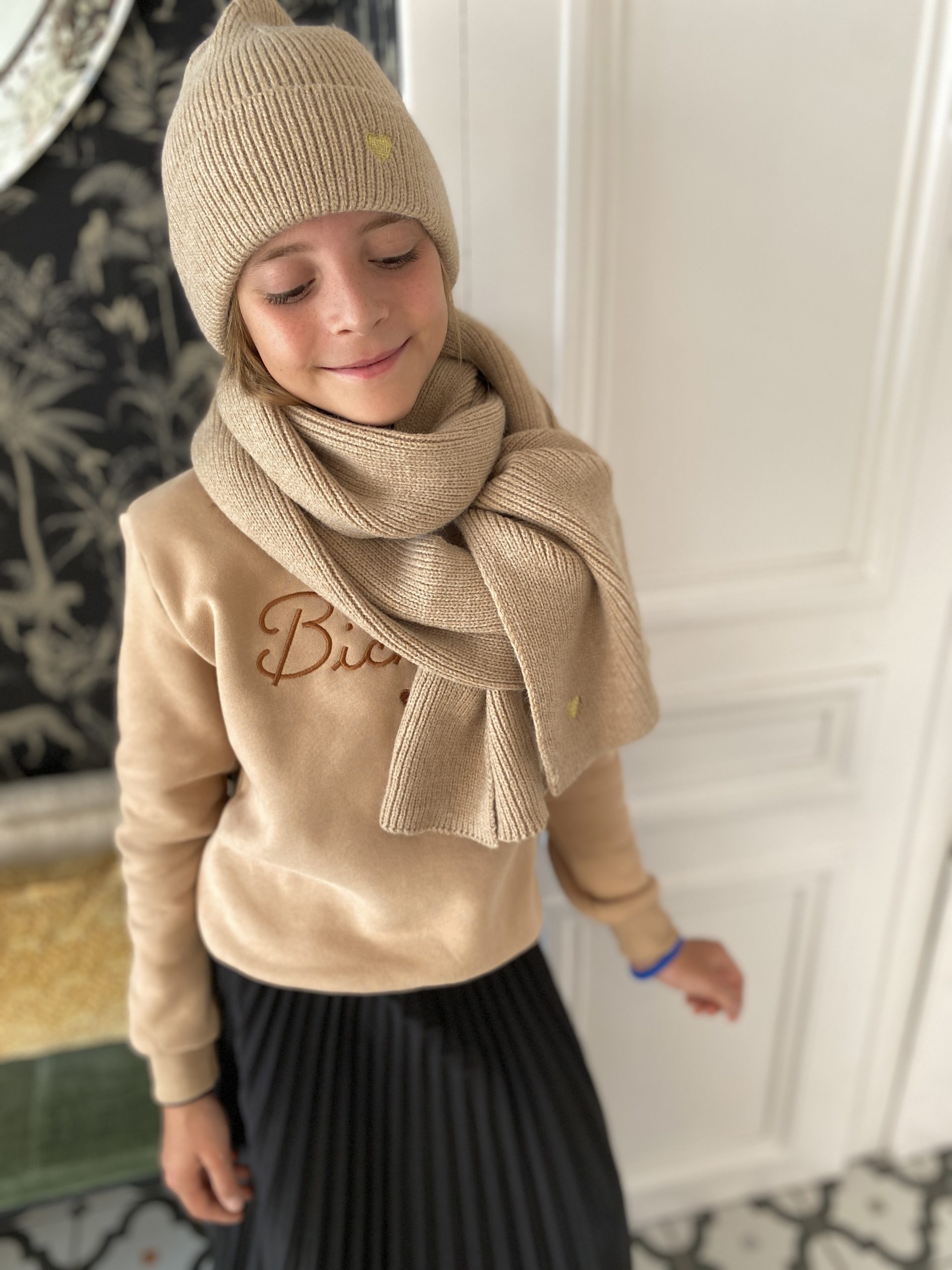 / Ensemble bonnet écharpe coeur doré camel