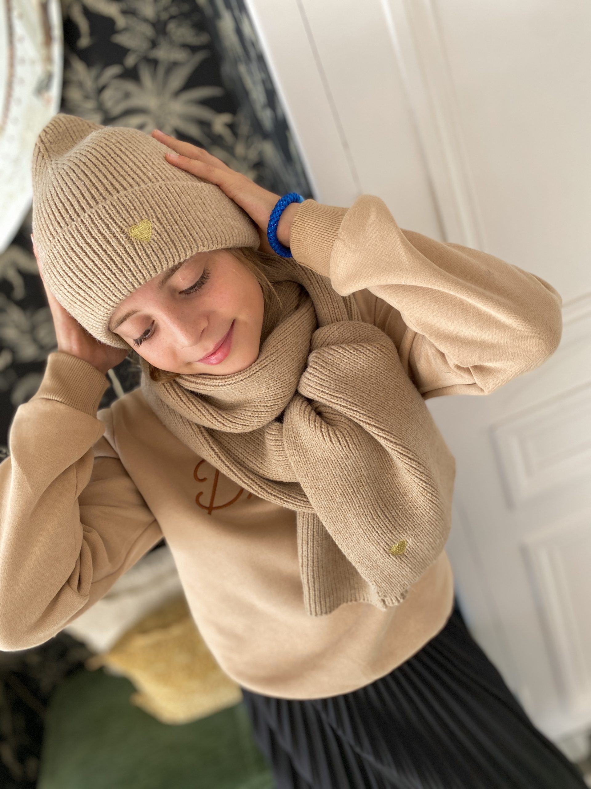 Ensemble bonnet écharpe coeur doré camel