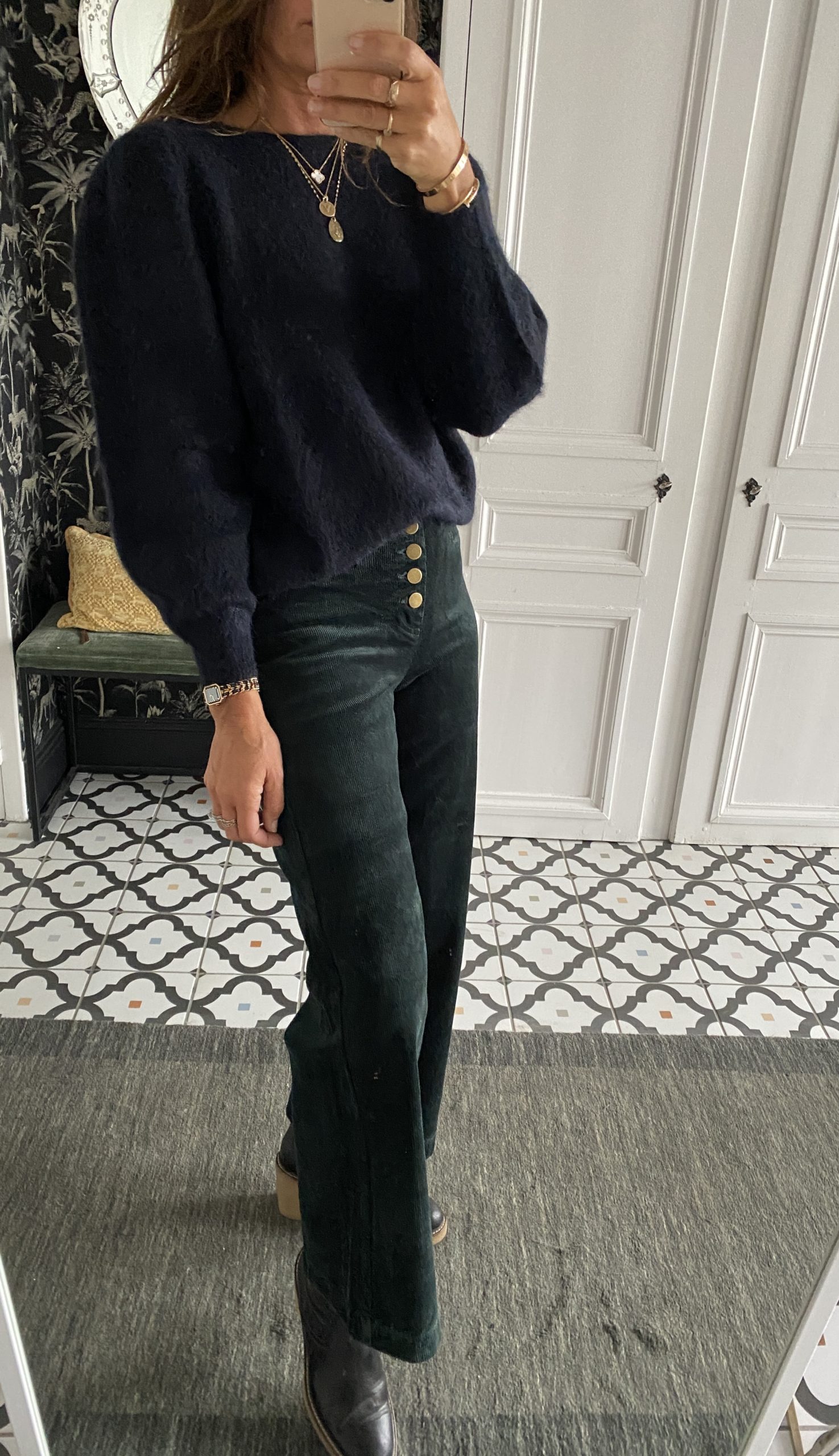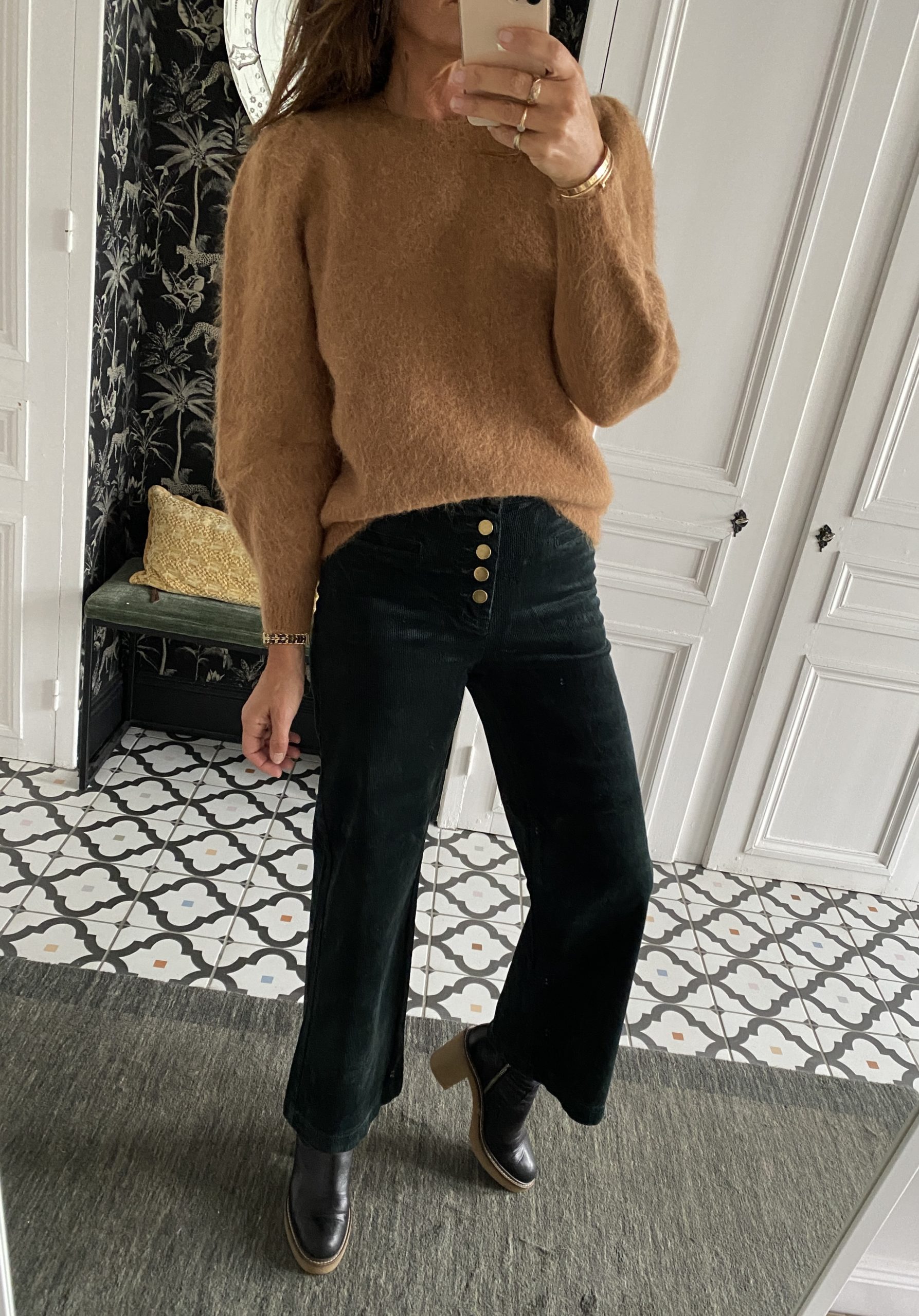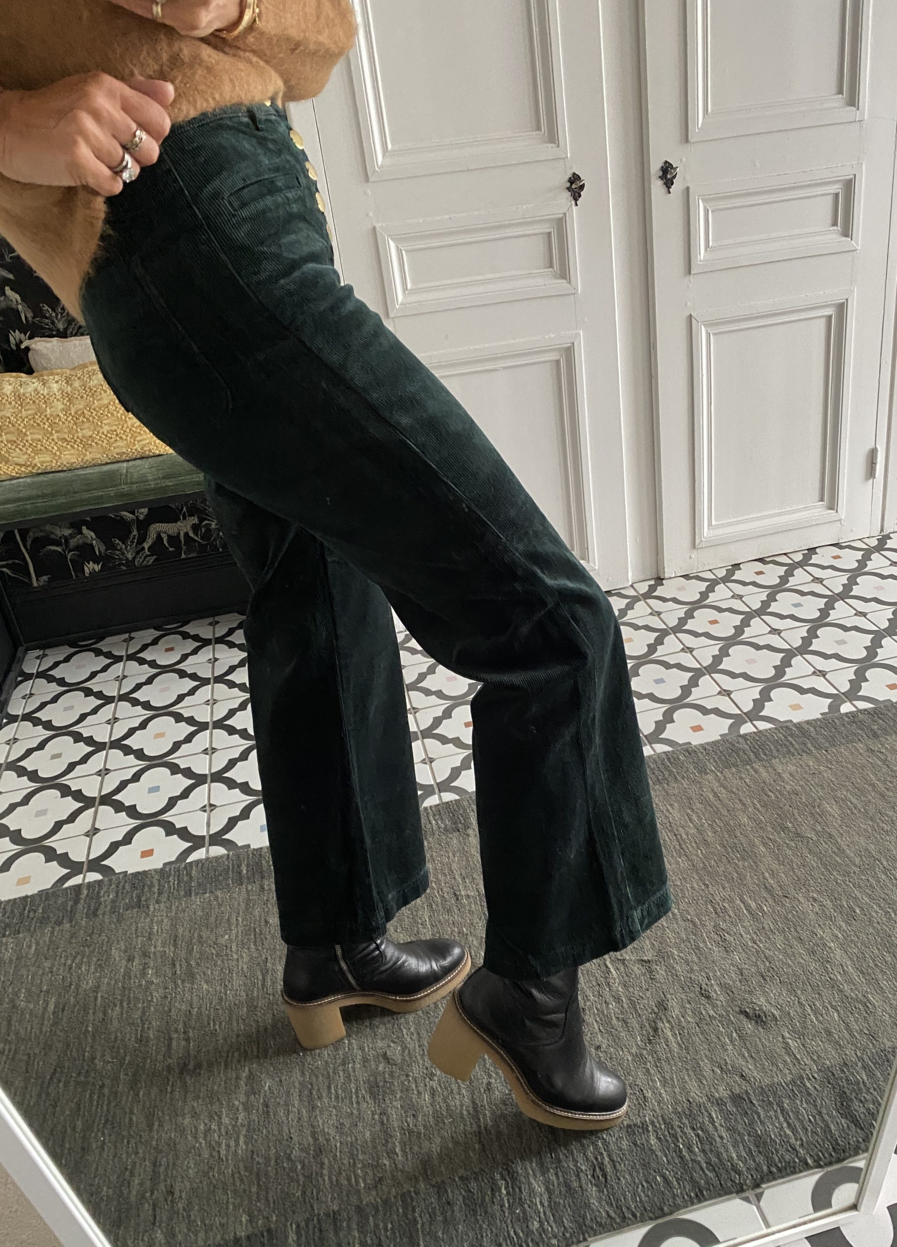 Pantalon 7/8 ème velours boutons dorés vert foncé