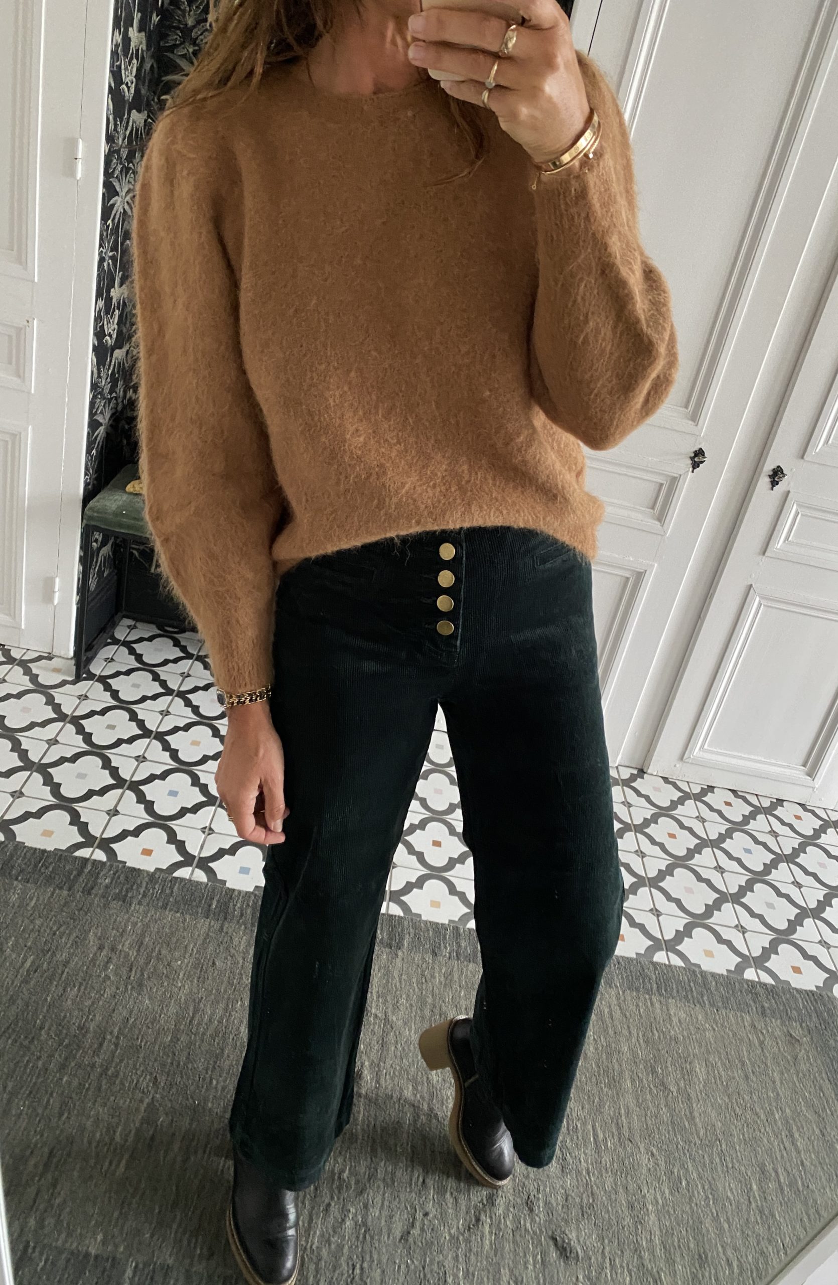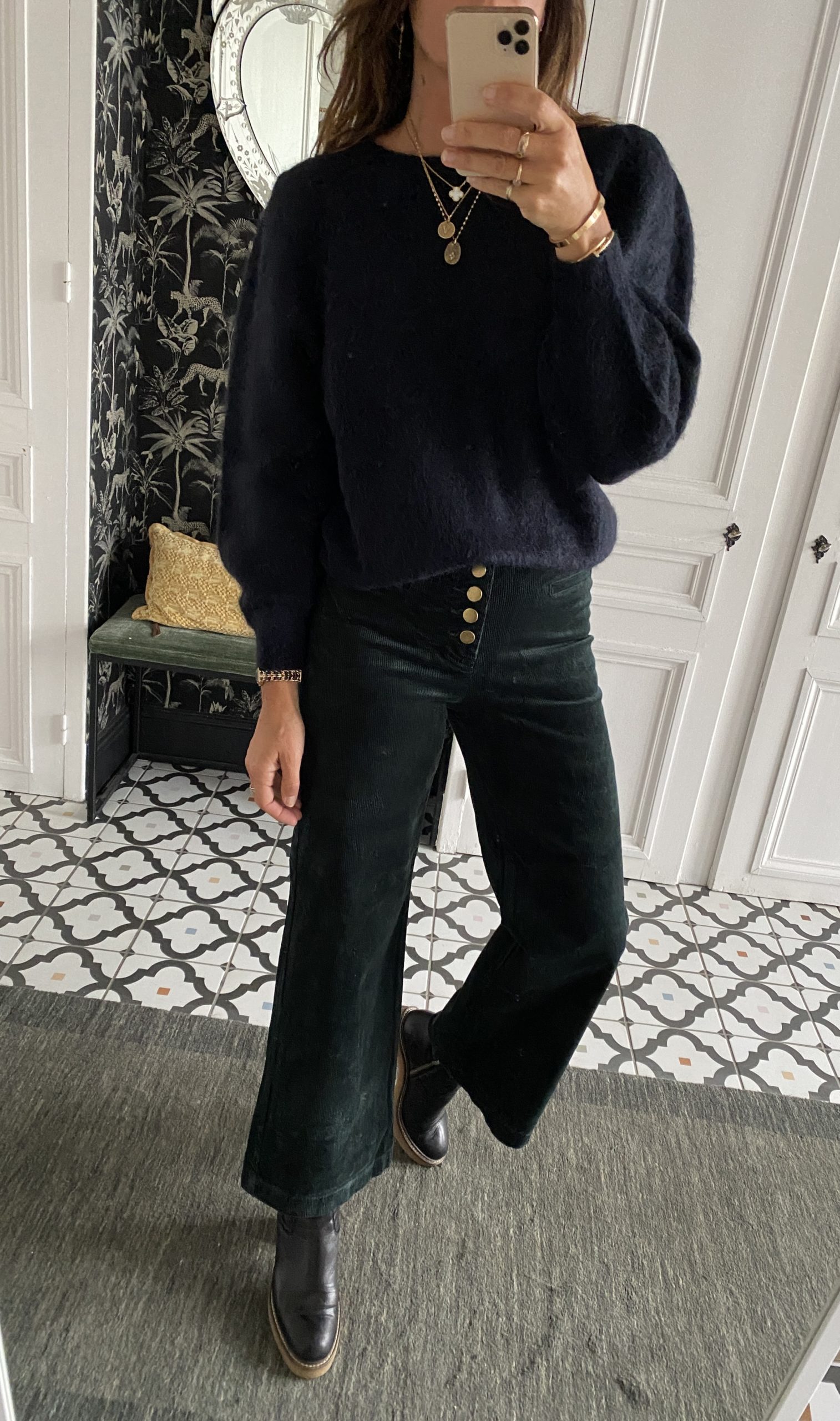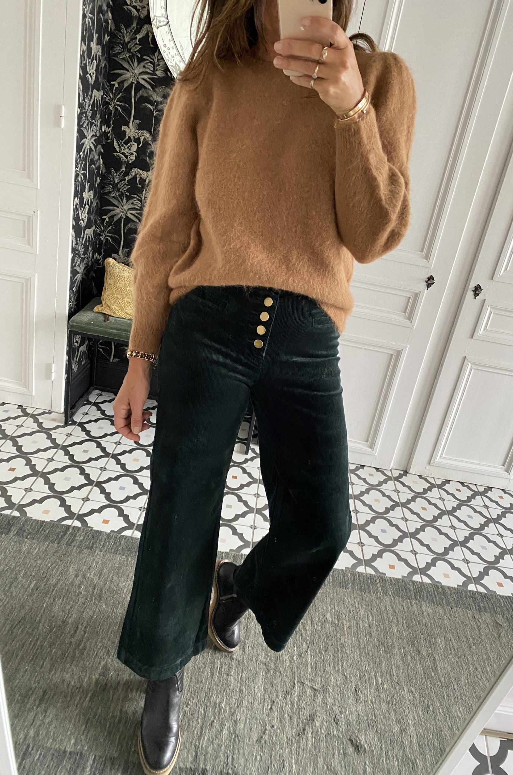 Pantalon 7/8 ème velours boutons dorés vert foncé
