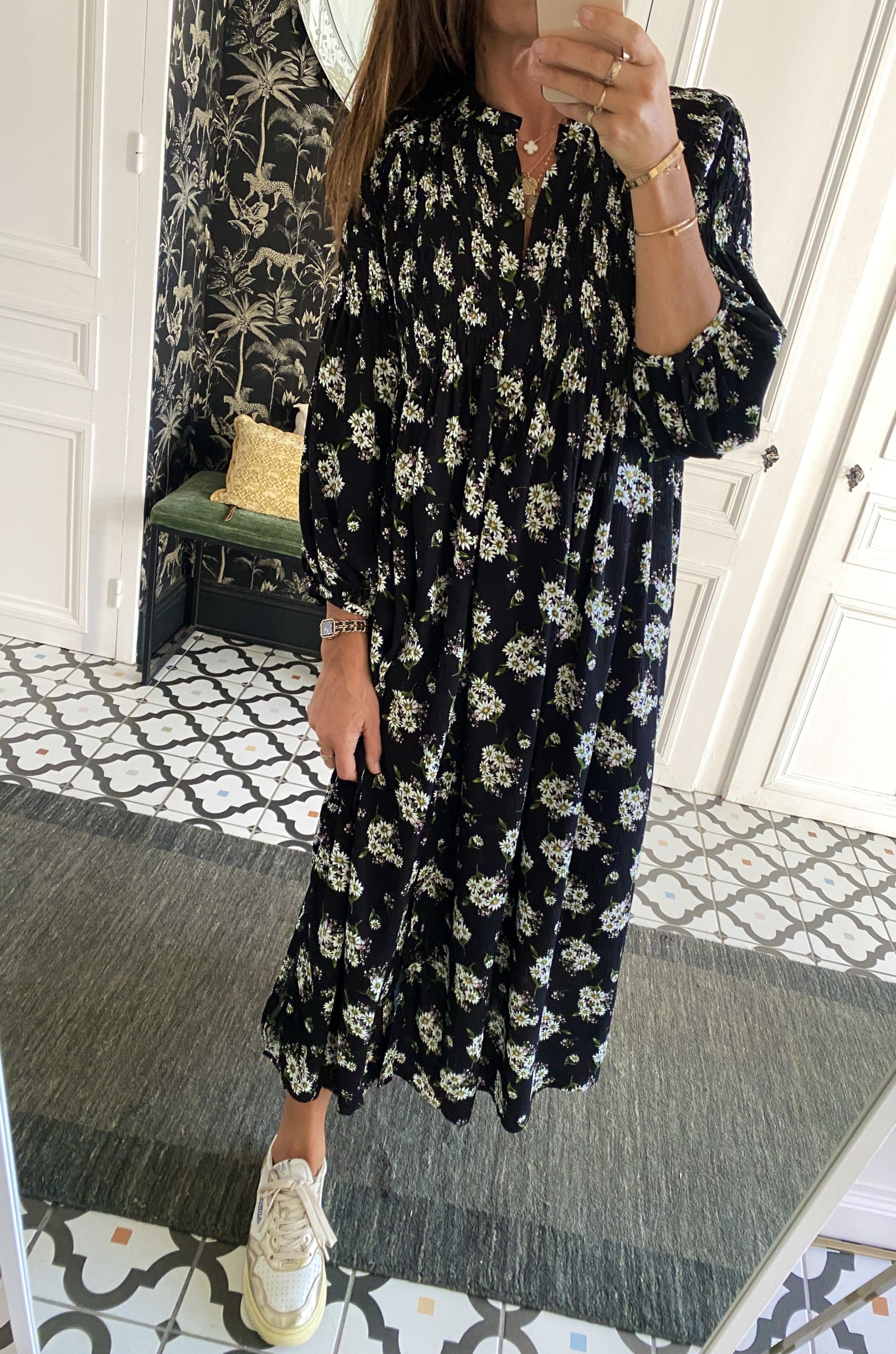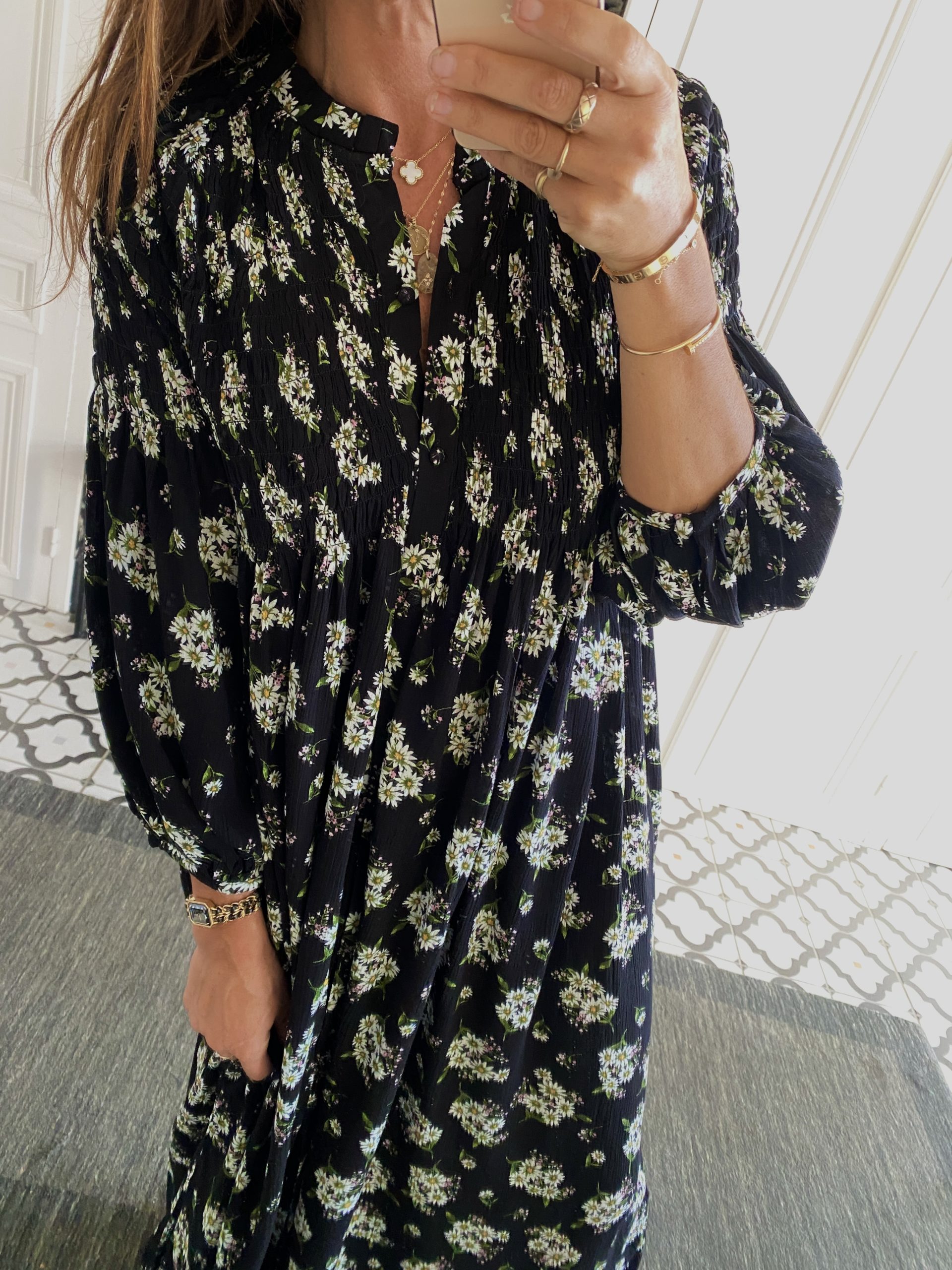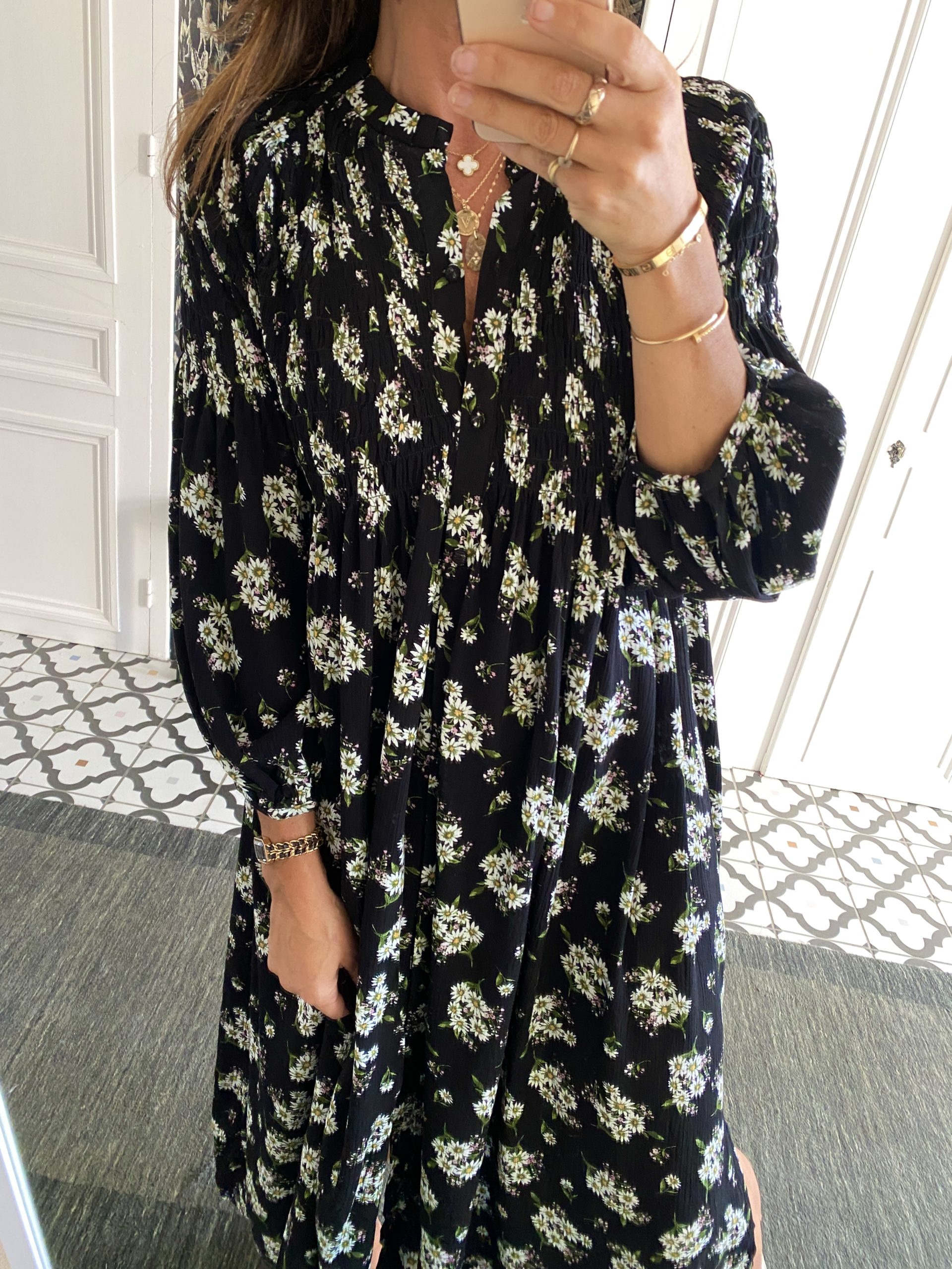 Robe smockée devant noir fleurie