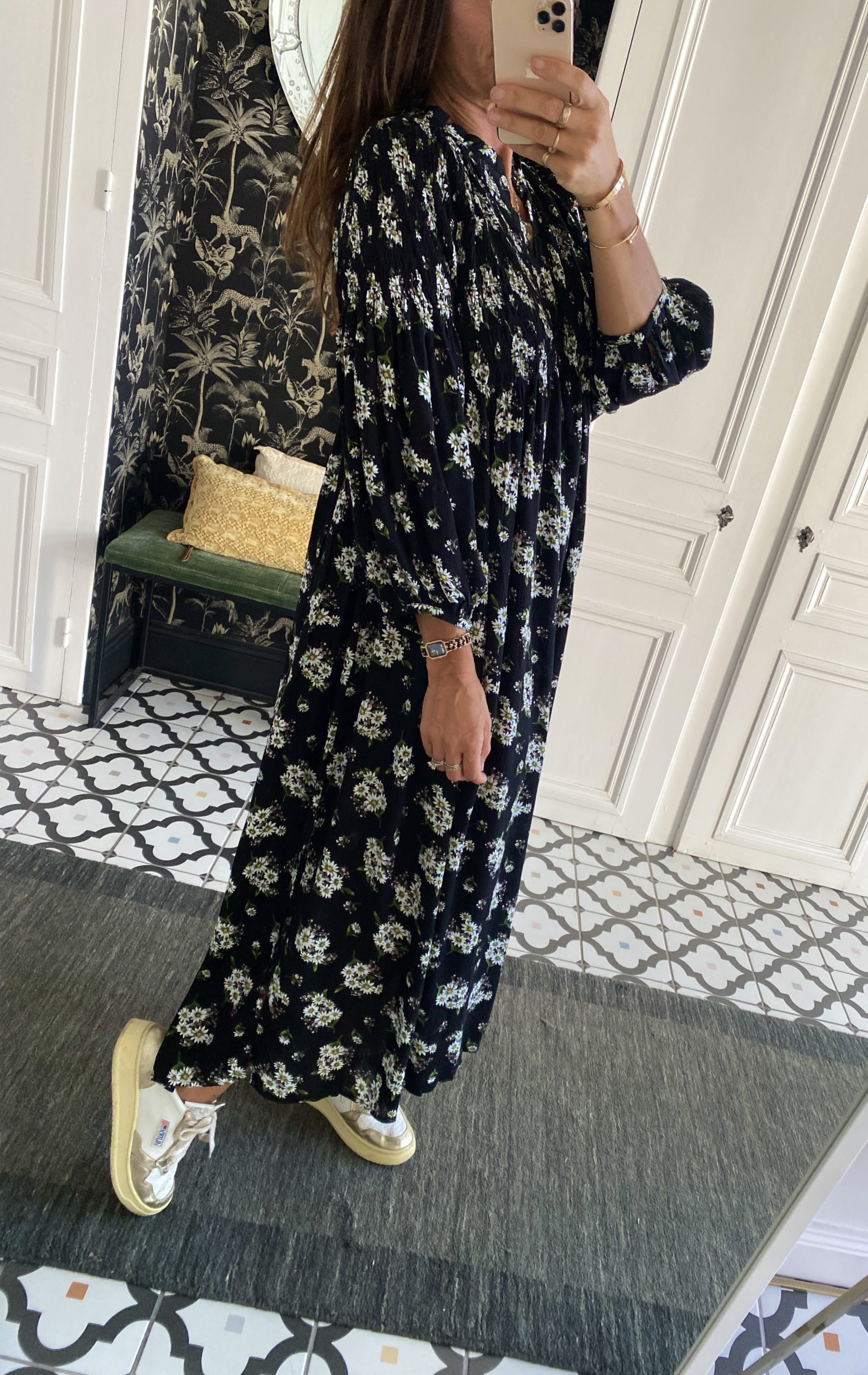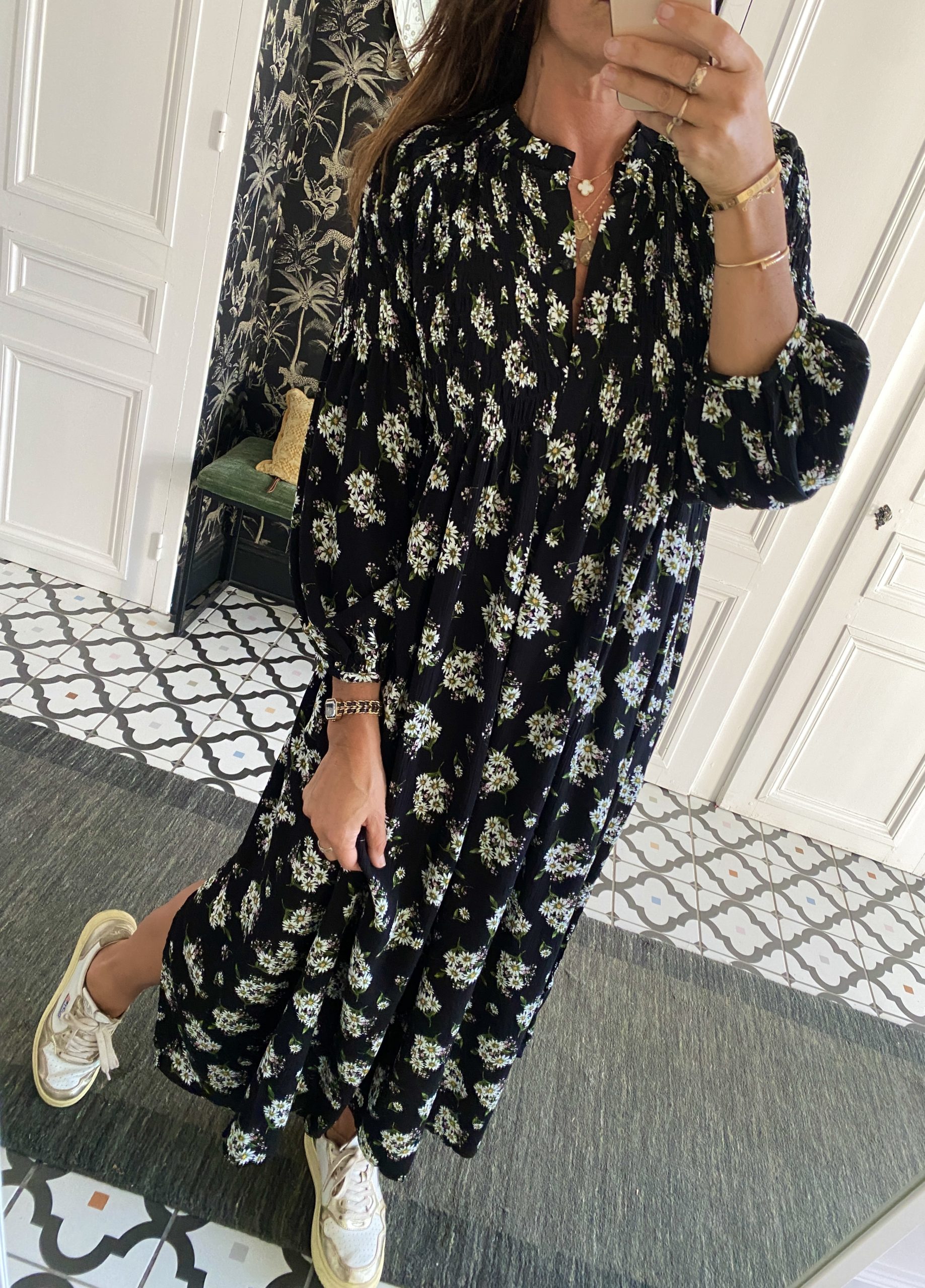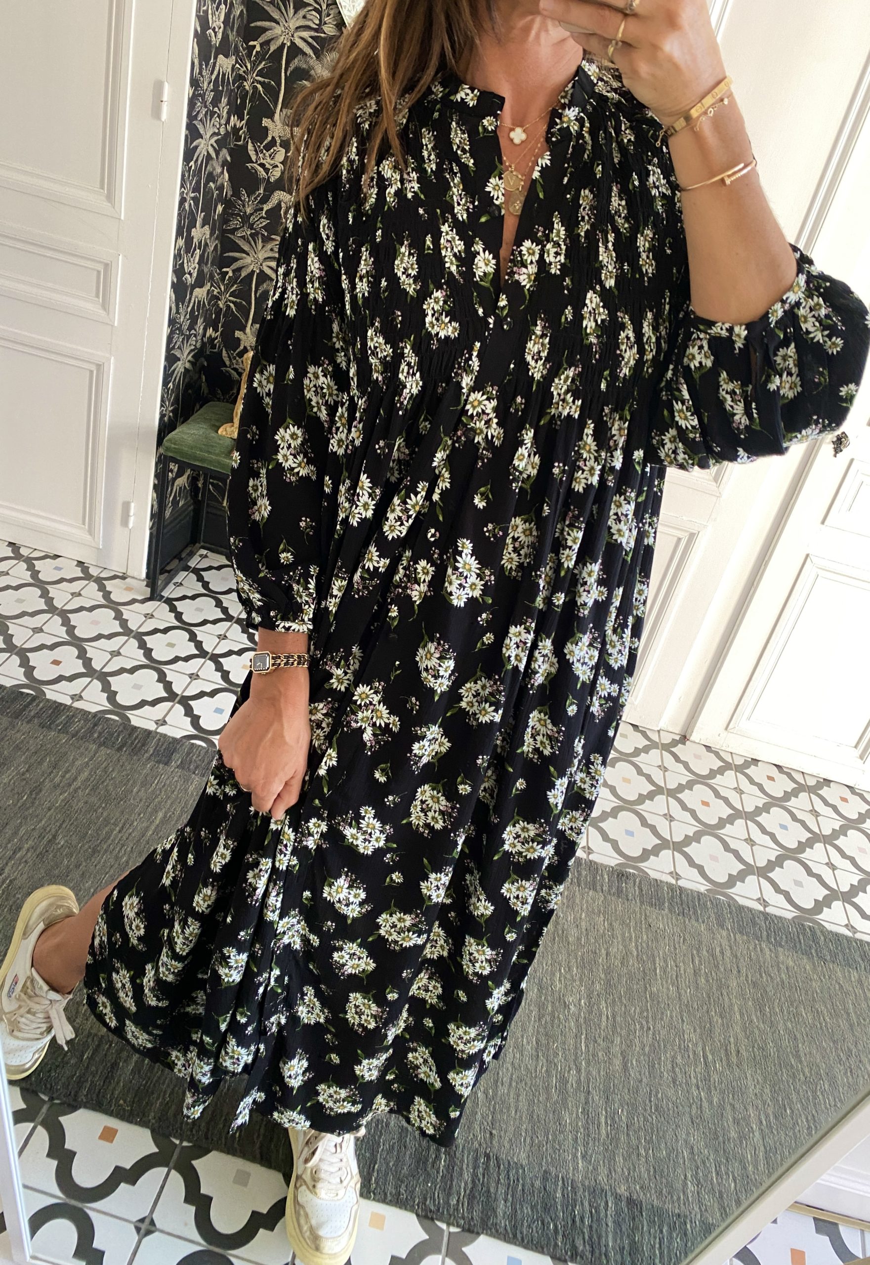 Robe smockée devant noir fleurie